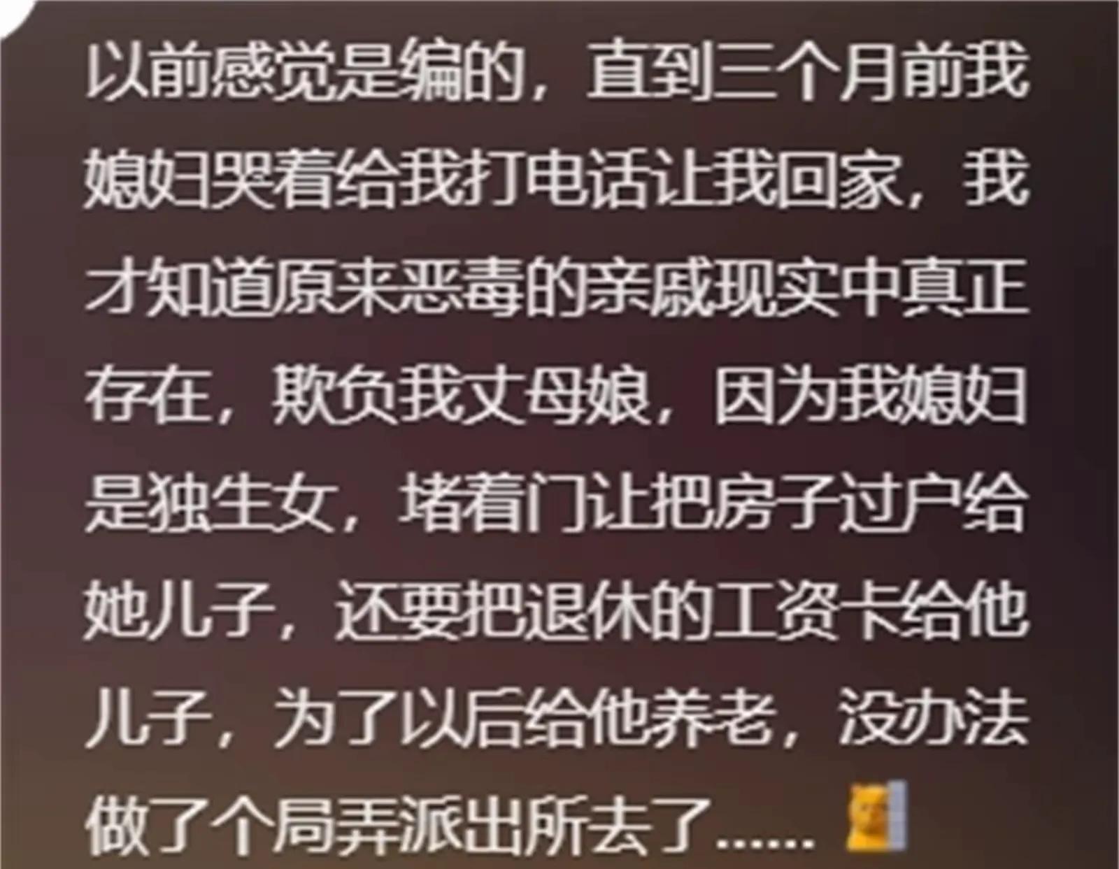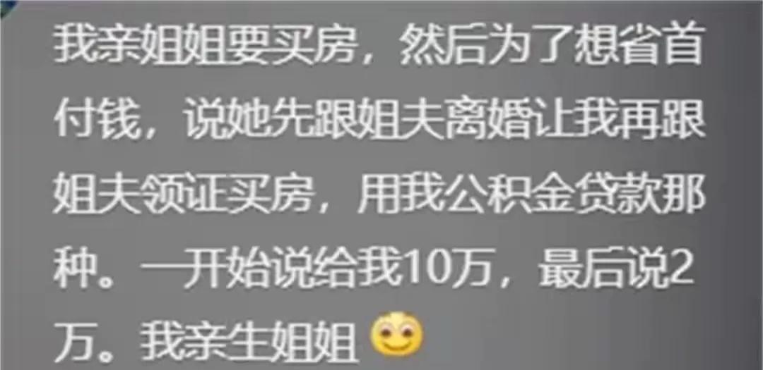 我亲大姨,我妈嫁城里,她嫁山脚下,为了赚媒婆费2000块,逼着我妈把我嫁她邻居,我妈不同意,然后把我表姐(小舅舅家的)嫁她邻居了,另一个表姐(大舅舅家的)也是她做媒,赚了2000,两个表姐过的都不幸福并且都离婚了,我亲姐嫁的好,姐夫工资高,她就撺掇我大表姐(她女儿,主要已婚有儿子)在我姐孕期去勾引我姐夫没成功,为这事闹僵了不走亲戚了,过了几年我工作好了找了个小官对象,又觍着脸来走亲戚